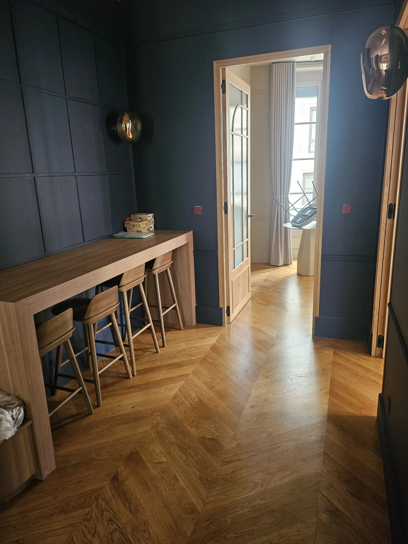 Le chantier a débuté par un ponçage professionnel du parquet, réalisé avec des machines adaptées afin de respecter le dessin précis de la pointe de Hongrie. Une teinte sur mesure a ensuite été appliquée pour harmoniser le sol avec l’intérieur du lieu. Enfin, un vernissage haute résistance a été posé pour protéger durablement le parquet et faciliter son entretien au quotidien.